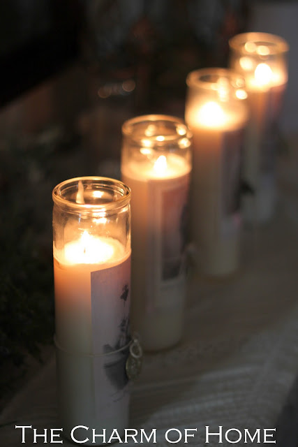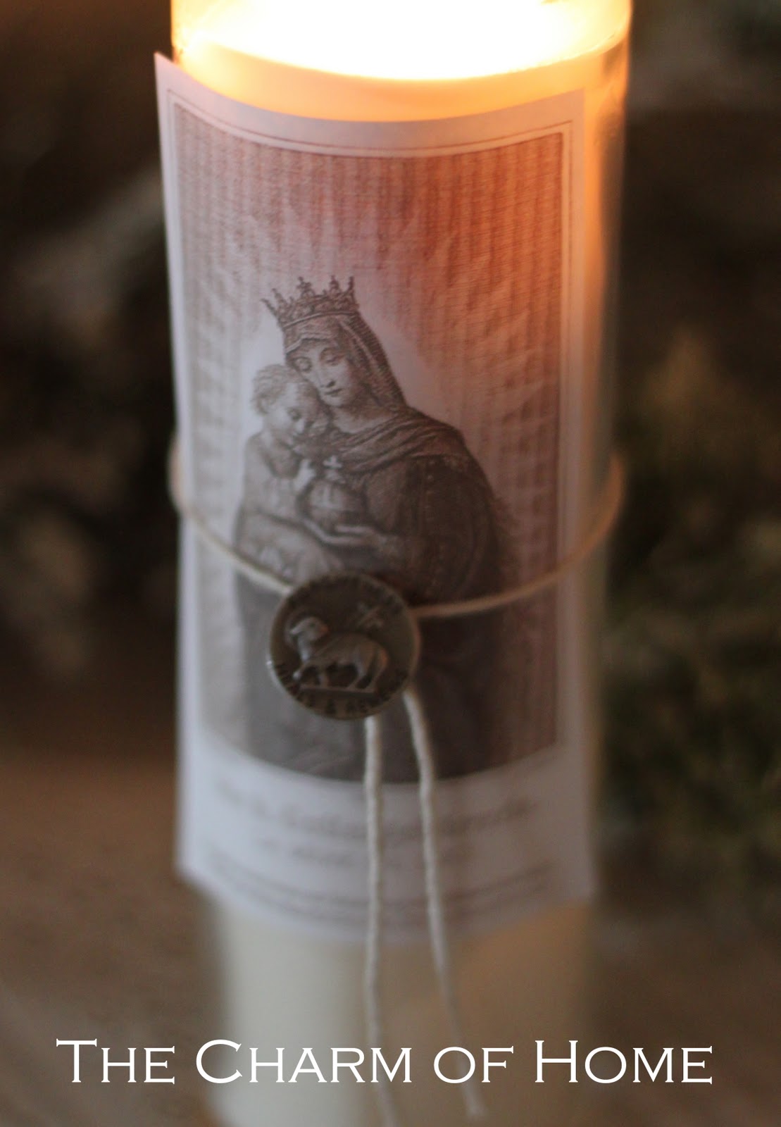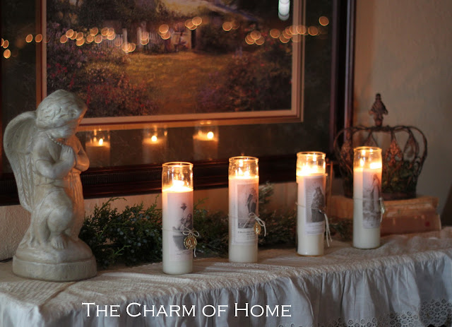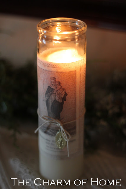 The candles are really easy to create.  You just need the candles, which I bought from the grocery for $1.79 each.  I printed the holy cards from The Graphics Fairy, just browse images under religious.  Then to finish them, I tied twine and religious charms onto the front.  As the candles burn, the images should glow even more.